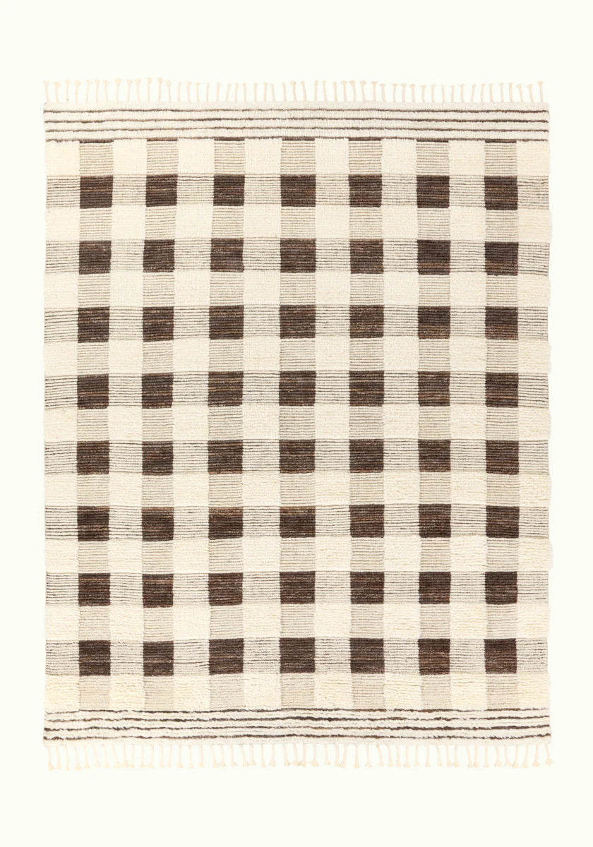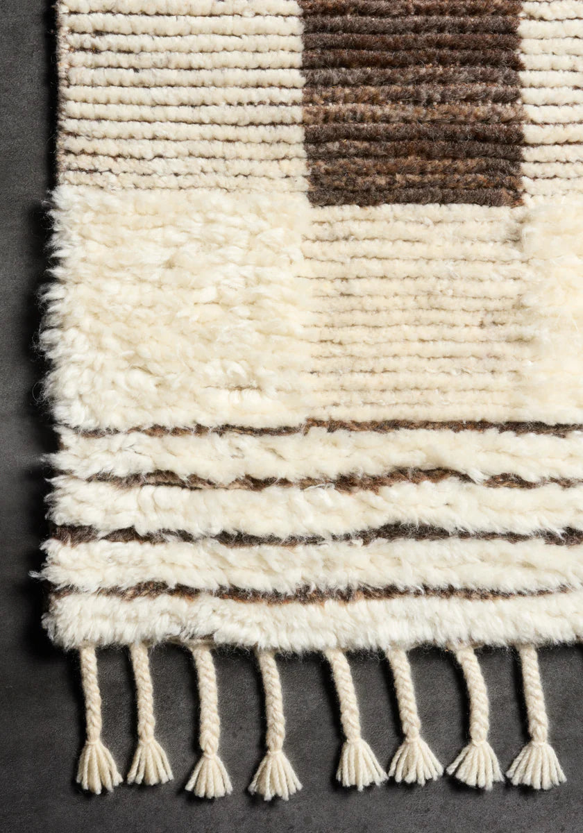 This rug beautifully merges modern design with the enchanting essence of Morocco, featuring a hand-knotted geometric grid pattern in contrasting hues of brown, cream, and tan. This plush, cut wool pile rug is accentuated with exquisite braided tassel details, offering both comfort and style. Perfect for cozy bedrooms and sitting areas, it adds warmth and a touch of global sophistication to any decor.