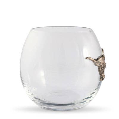 Evoke images of wide-open ranges and rugged individualism when serving your favorite vintage in this stemless wine glass. Boasting the bold, iconic image of a Texas longhorn formed in solid pewter, this barware celebrates the freedom of the Wild West.