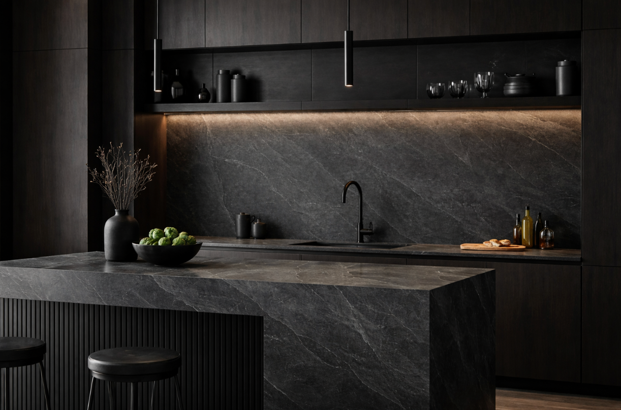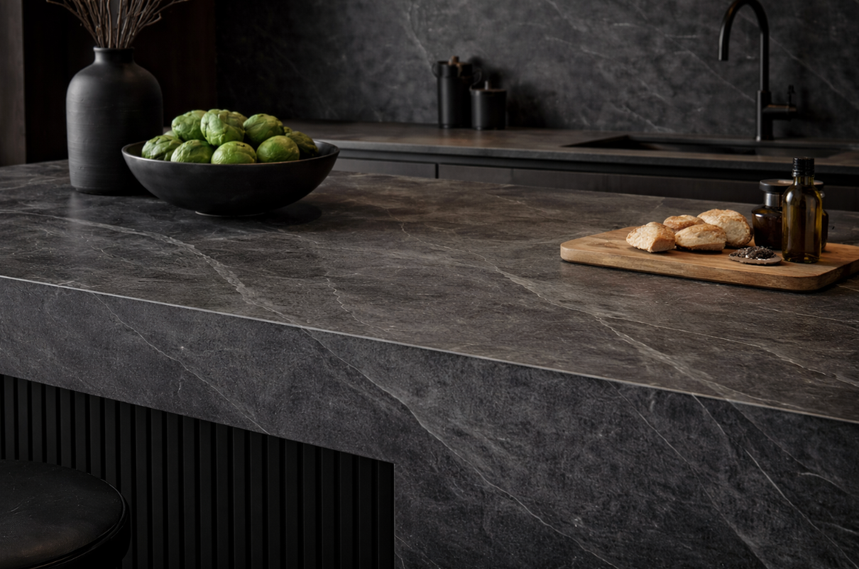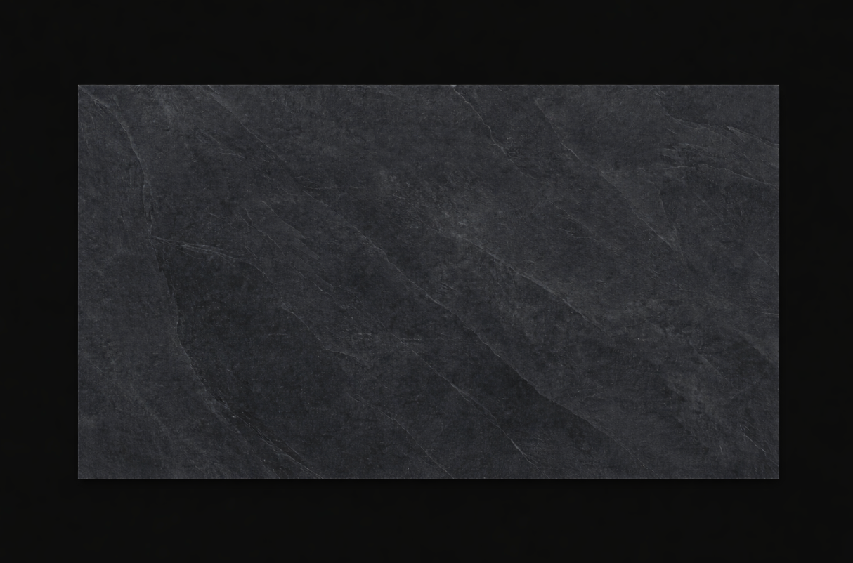 A deep charcoal porcelain with an industrial spirit and a refined leathered surface, offering the richness of slate with modern durability.
