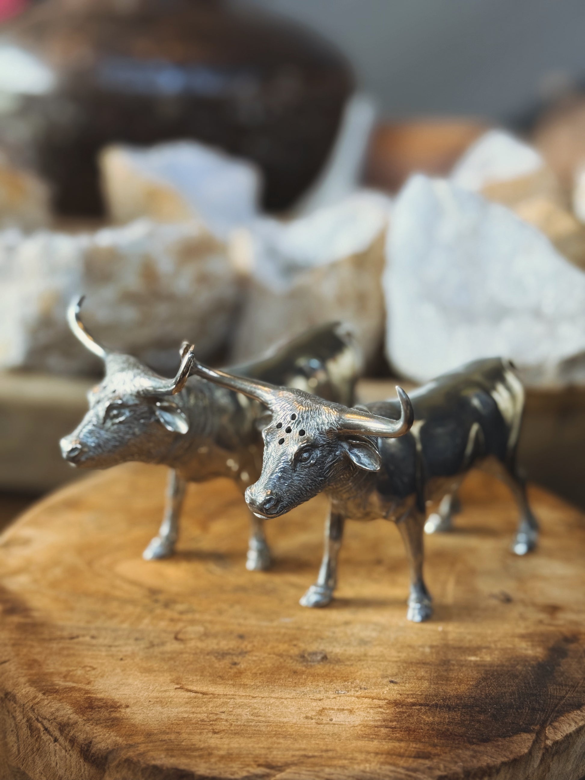 This pair of longhorns is home on the range in your ranch kitchen or at your barbeque buffet! Handcrafting in luxury grade pewter.