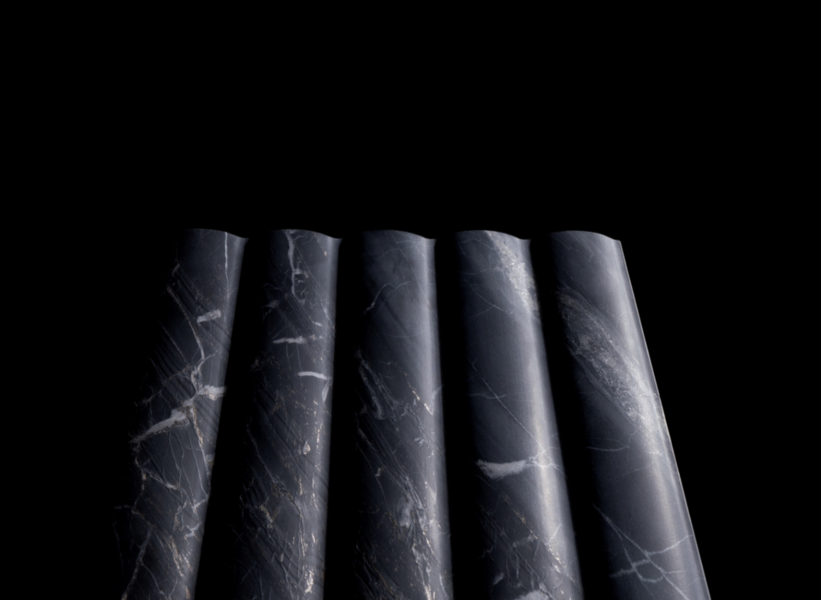 The Elemental Roll tile offer a robust echo of classical forms, their spacious curves projecting strength and presence. This design magnifies the room’s volume, capturing and bending light to enchant the observer’s eye.