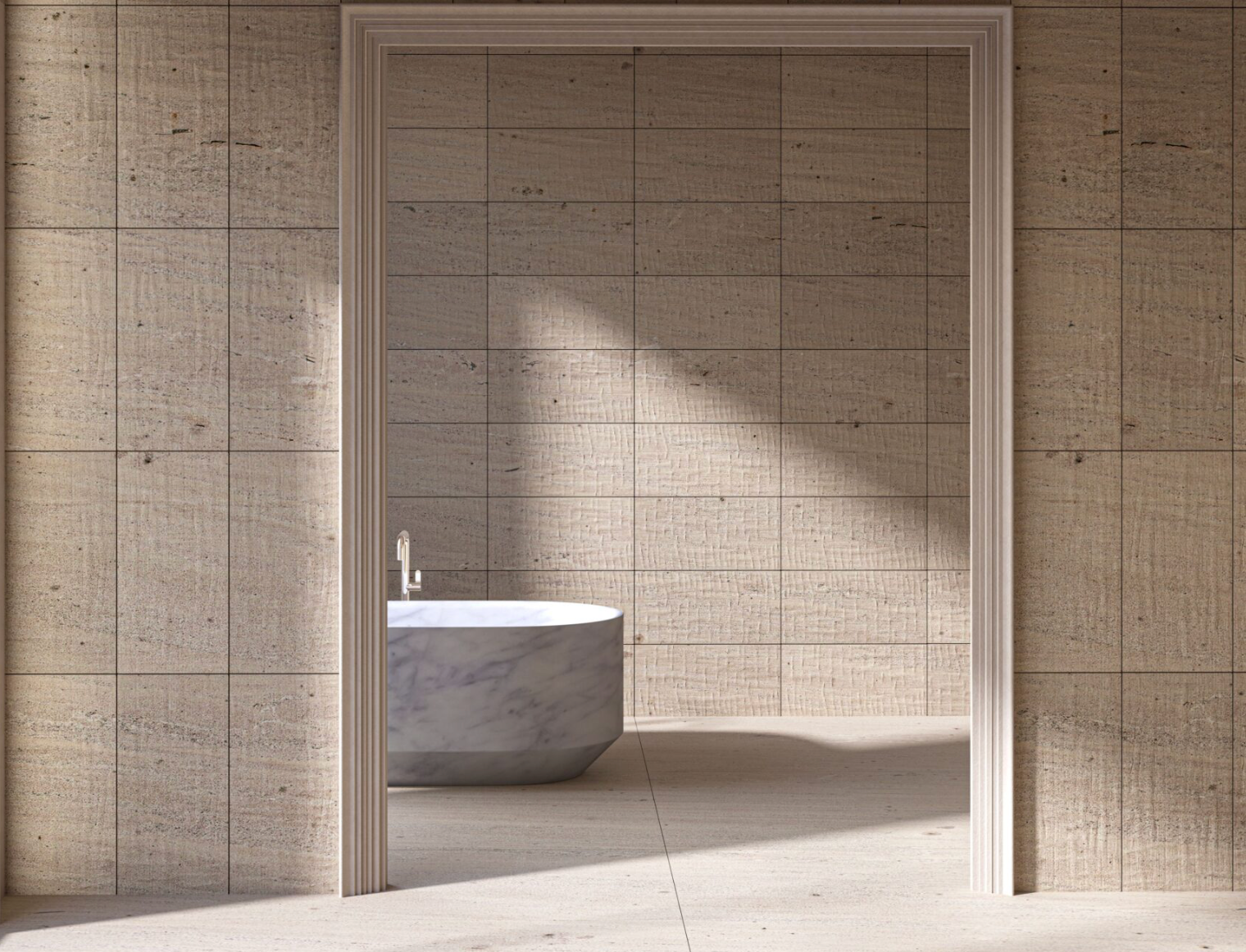 The bamboo-inspired dimensional pattern carved in marble or limestone encapsulates a harmonious blend of organic inspiration and artistic interpretation.